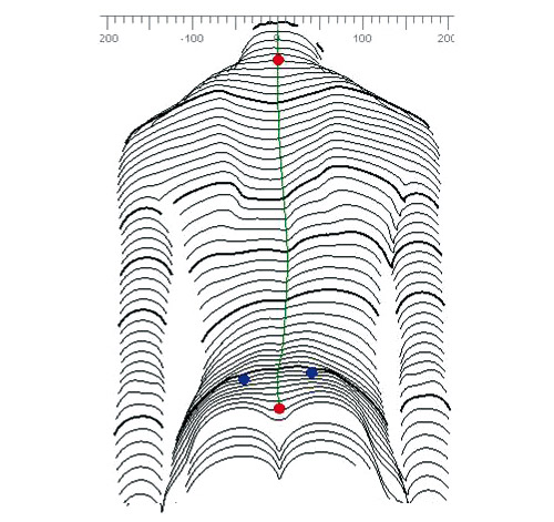 Die Untersuchung liefert mit dem Verfahren der Video-Rasterstereografie ein präzises Modell der Rückenoberfläche. Der Rücken wird in einem Raster aus gebündelten Lichtstrahlen abgebildet. Mit Hilfe modernster Computertechnik entsteht eine dreidimensionale Abbildung der Rückenform. Anhand der Oberflächenstrukturen wird der Verlauf der Wirbelsäule, der Beckenstand und die Rotation der einzelnen Wirbelkörper zueinander festgestellt. Auf der Grundlage dieser Daten erfolgt bei der weiteren Vermessung eine Überprüfung, ob ein Ausgleich mittels einer Einlegesohle oder einer Absatzerhöhung sinnvoll ist.